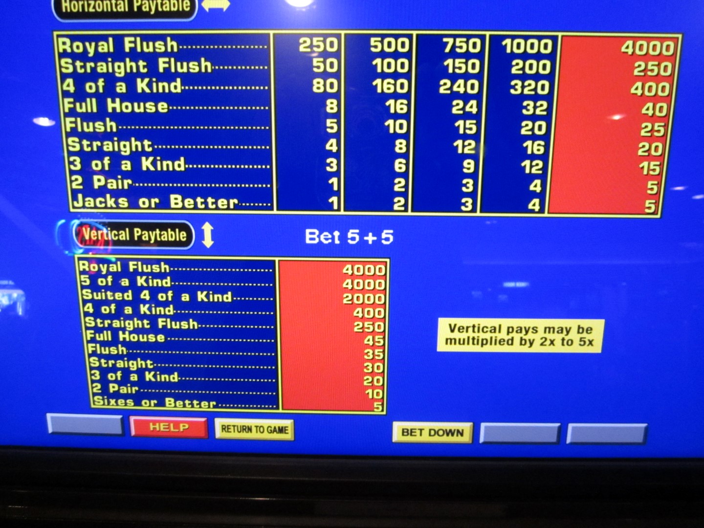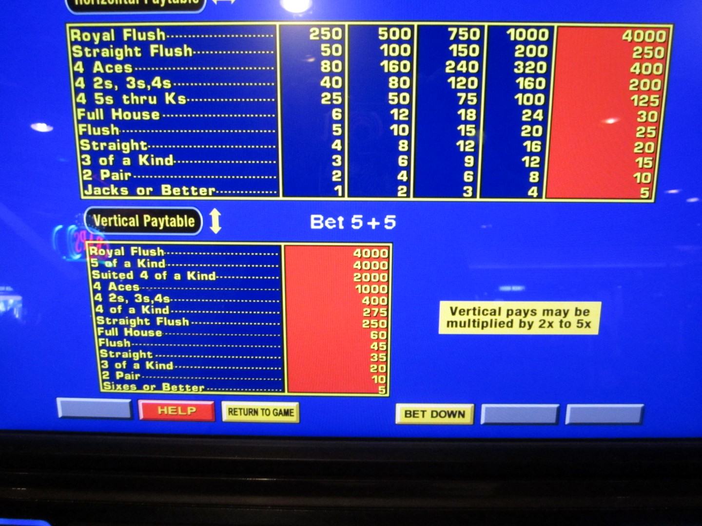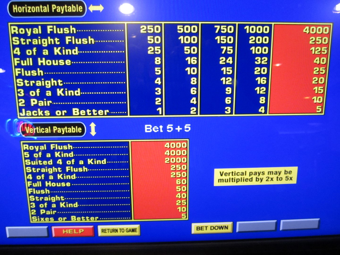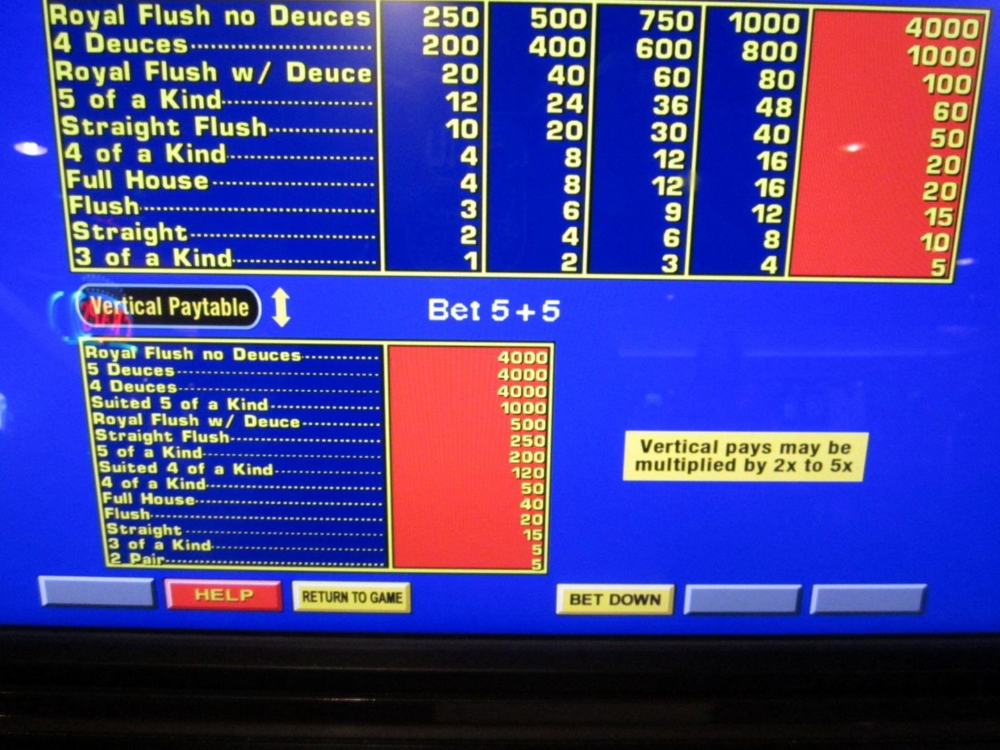 - O jogador também terá direito a multiplicadores nas mãos verticais, de acordo com o número de descartes na mão original. Se o jogador tiver zero ou cinco cartas, nenhum multiplicador estará disponível. Detalhes sobre os multiplicadores possíveis e médios são mostrados na tabela a seguir. A coluna "Multiplicador Médio" mostra o multiplicador médio a ser aplicado à vitória, após considerar a probabilidade de um multiplicador e a média desses multiplicadores.