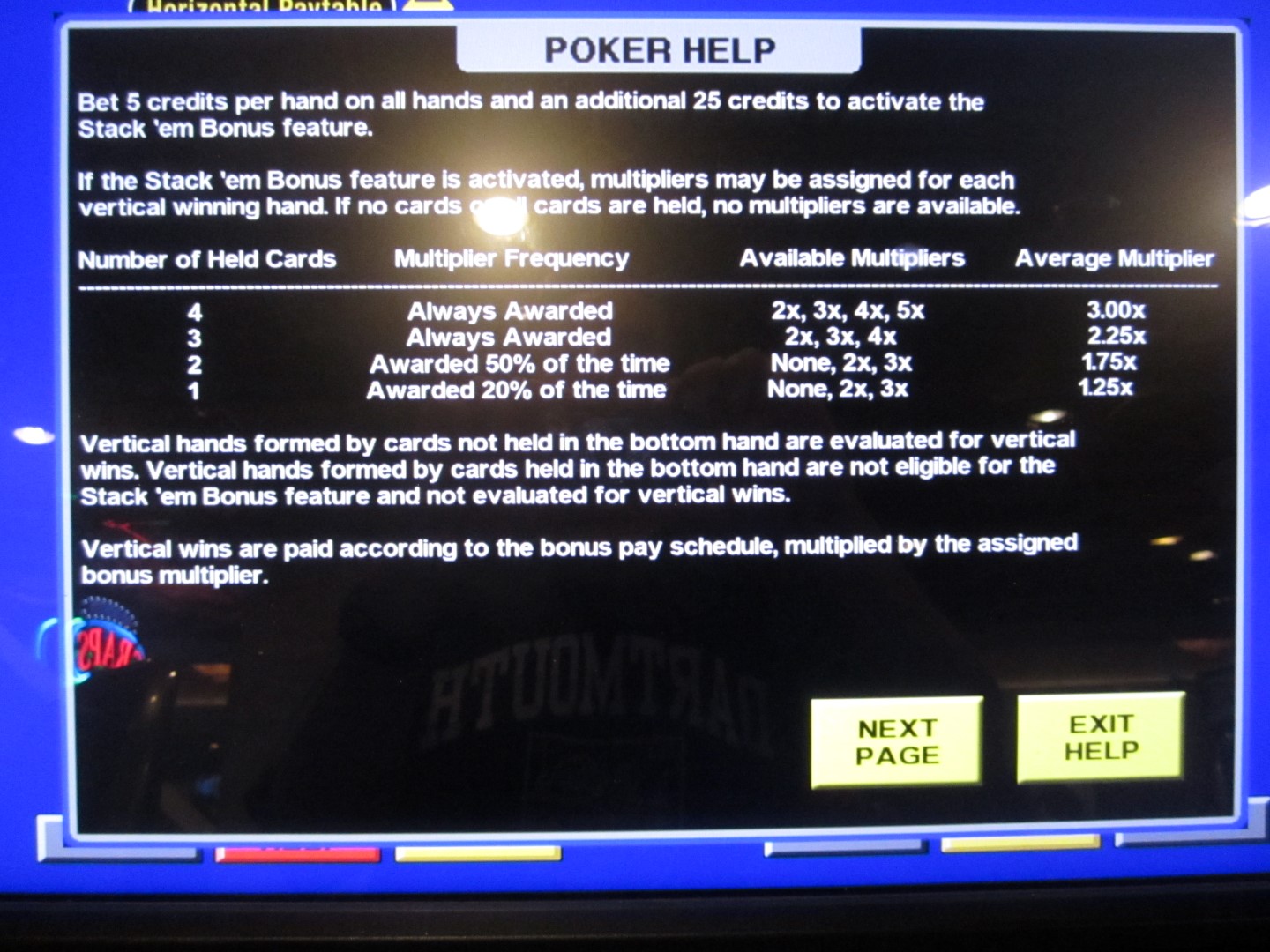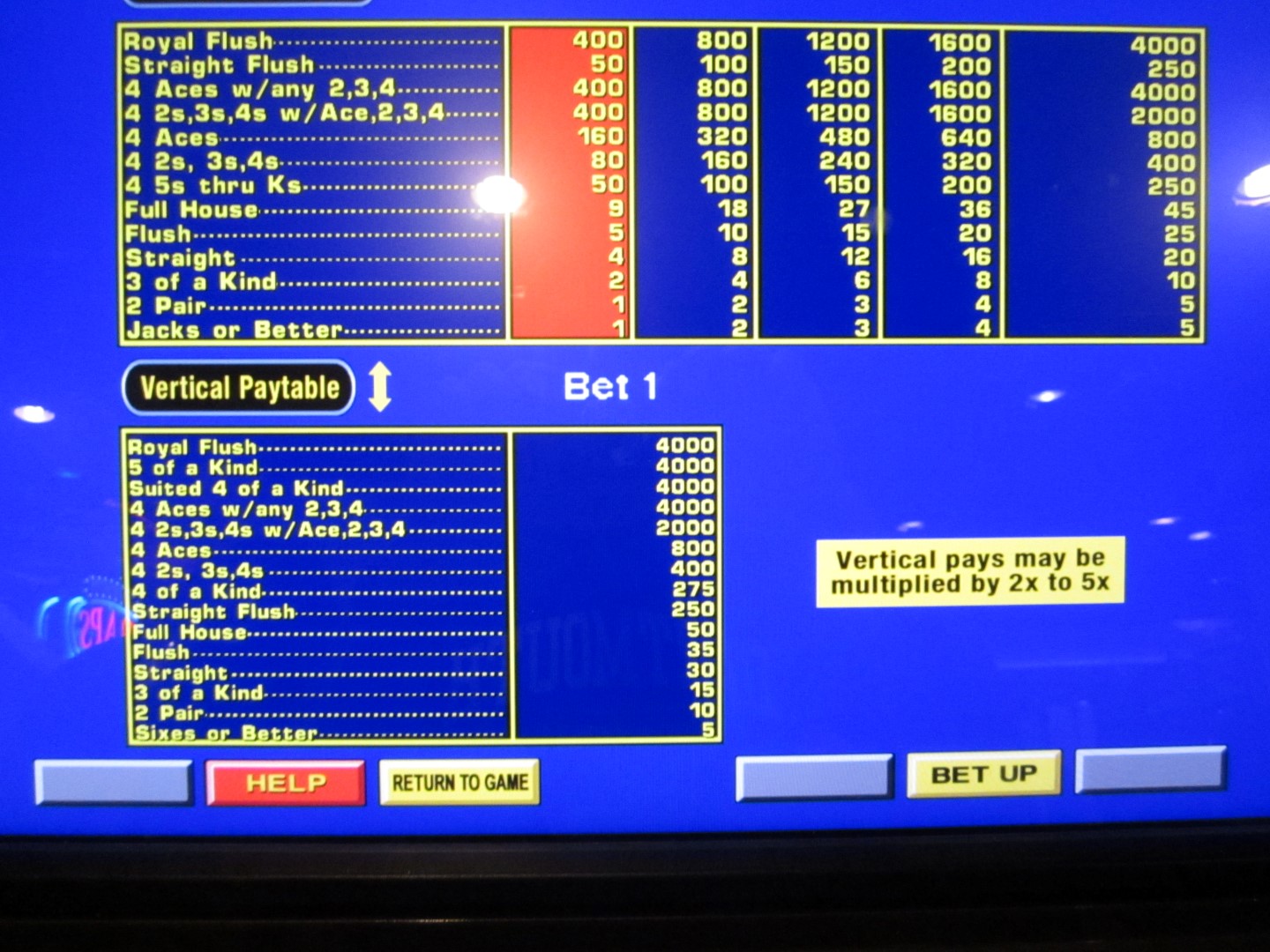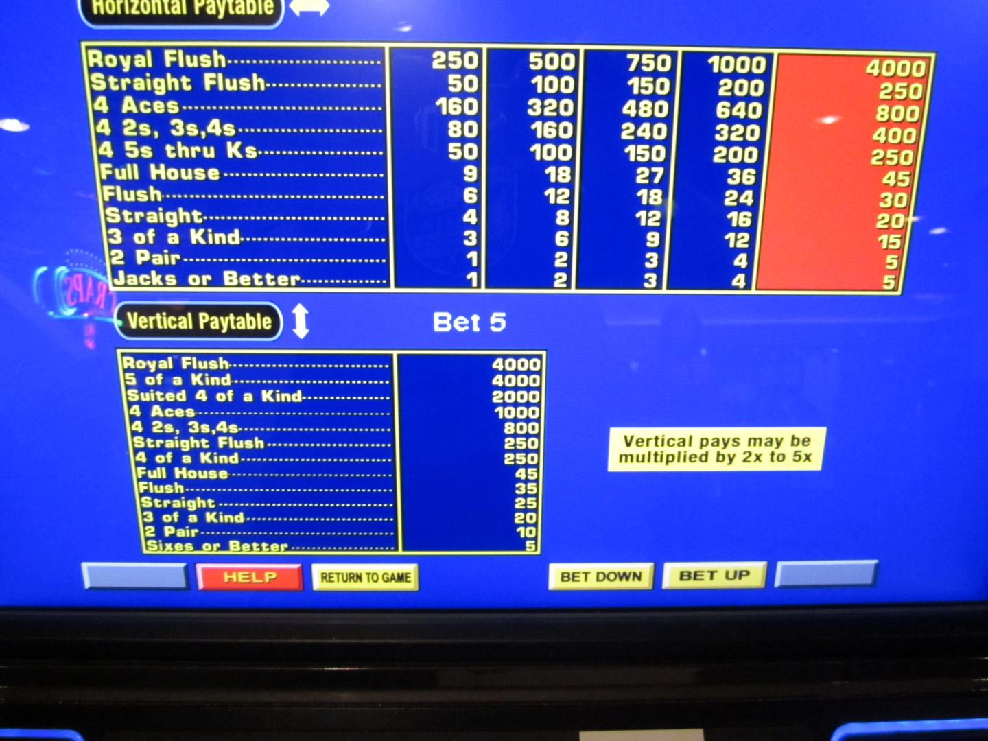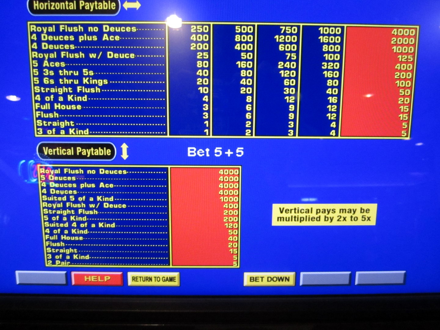 - O jogador também terá direito a multiplicadores nas mãos verticais, de acordo com o número de descartes na mão original. Se o jogador tiver zero ou cinco cartas, nenhum multiplicador estará disponível. Detalhes sobre os multiplicadores possíveis e médios são mostrados na tabela a seguir. A coluna "Multiplicador Médio" mostra o multiplicador médio a ser aplicado à vitória, após considerar a probabilidade de um multiplicador e a média desses multiplicadores.