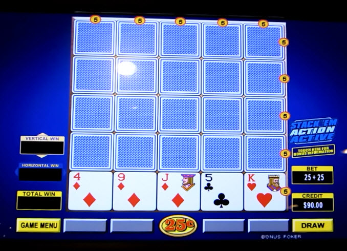 - Stack 'Em Poker pode ser jogado como um vídeo poker convencional de cinco jogadas. O jogo base é apresentado em cinco mãos horizontais, em uma matriz de cartas de cinco por cinco.