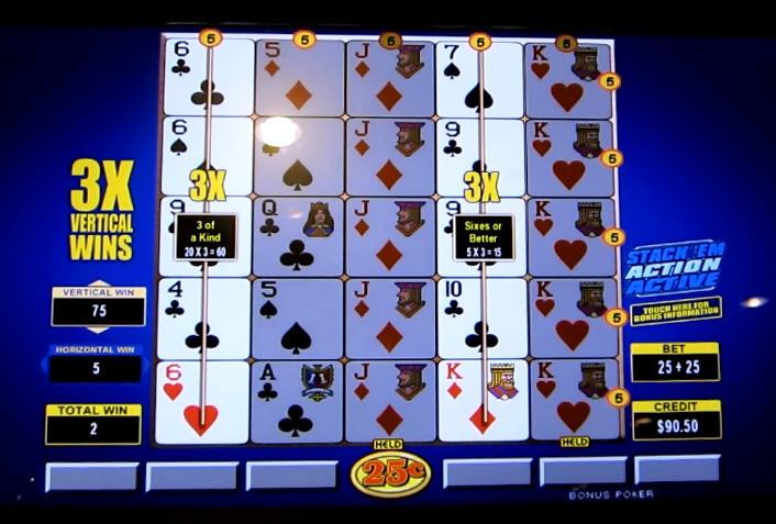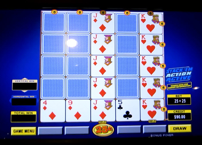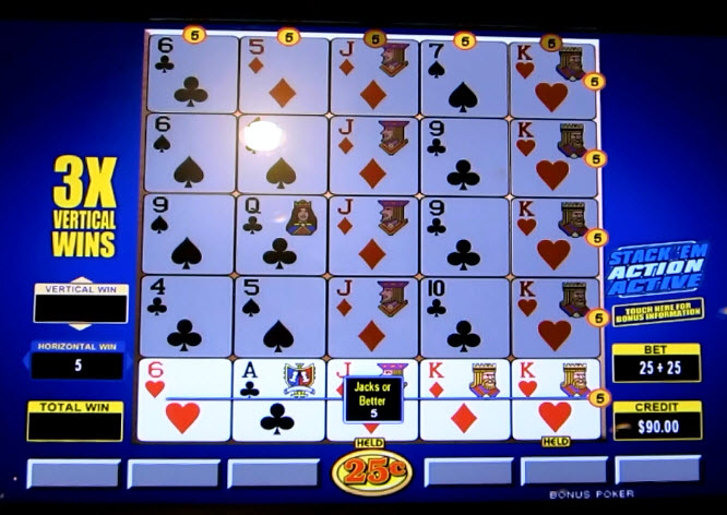 Stack 'em Poker é uma variante de vídeo pôquer que observei no Harrah's Las Vegas em 17 de setembro de 2014. Funciona como um vídeo pôquer de cinco mãos, com cinco mãos empilhadas verticalmente. Se o jogador fizer uma aposta adicional, ele se qualifica para ganhos formados por mãos tanto na horizontal quanto na vertical.
