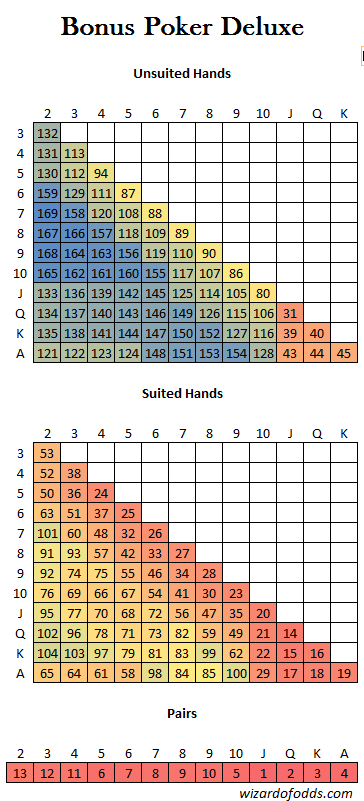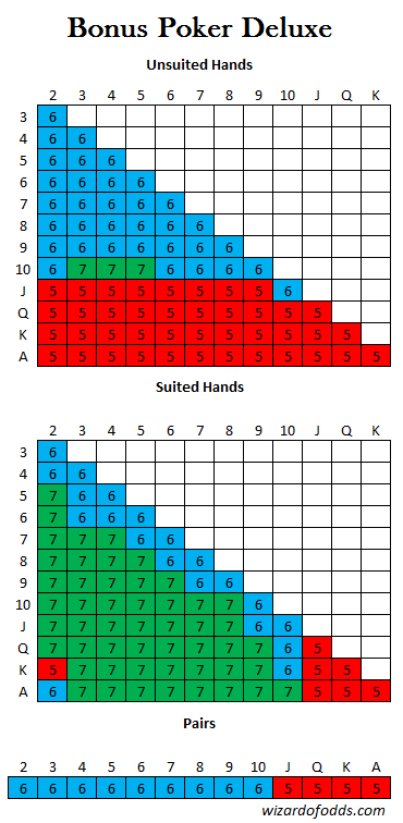 A estratégia a seguir é adequada para o jogo Bonus Poker Deluxe com as seguintes tabelas de pagamento. Os ganhos são expressos por moeda, com base em uma aposta de cinco moedas por mão.