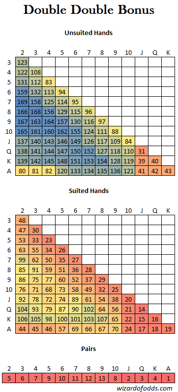 A estratégia a seguir é adequada para o jogo Double Double Bonus, com as seguintes tabelas de pagamento. Os ganhos são expressos por moeda, com base em uma aposta de cinco moedas por mão.
