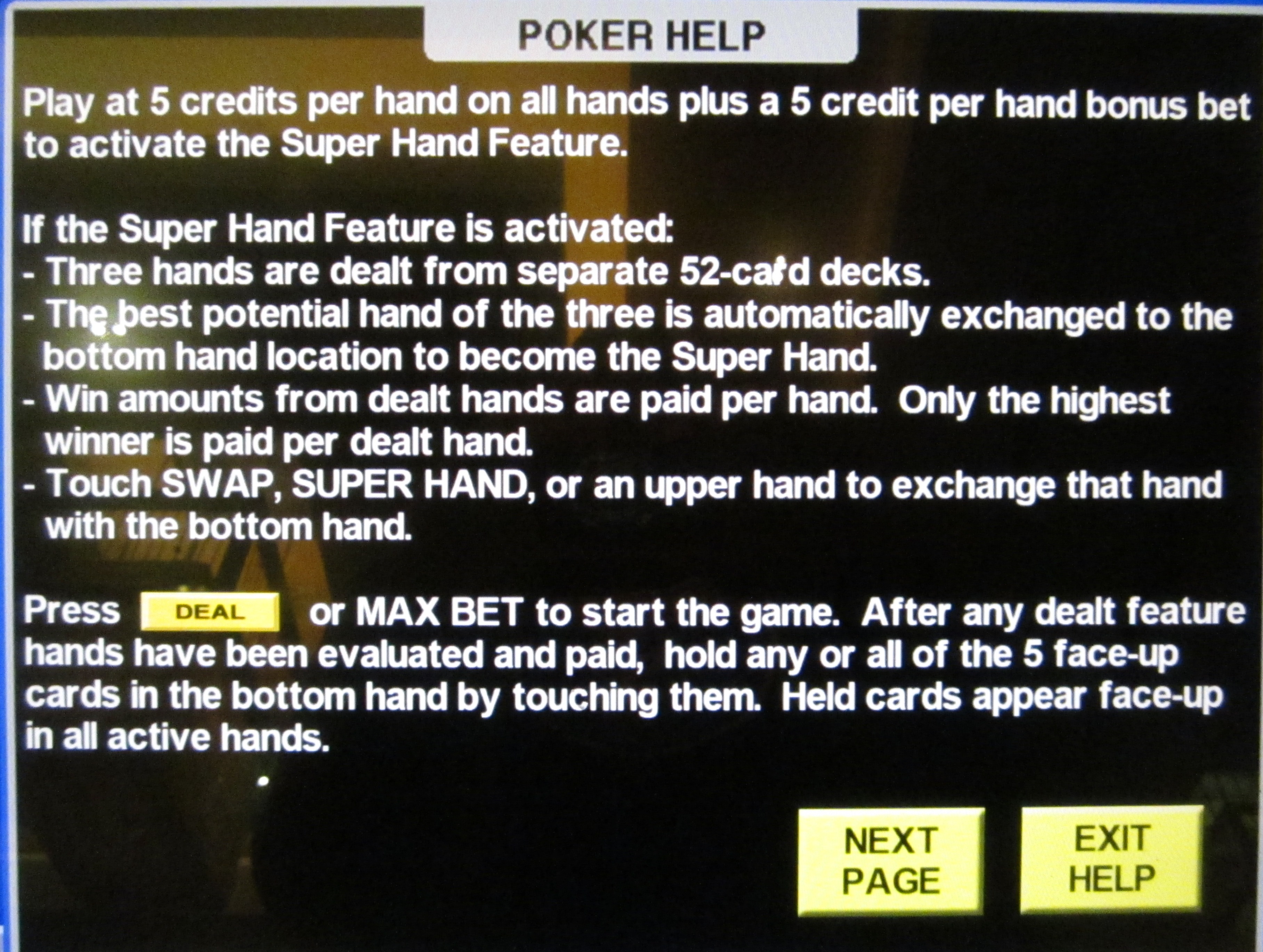 Vi o Super Hand Poker pela primeira vez na Global Gaming Expo de 2015. A segunda vez foi no cassino Red Rocks em Las Vegas, em 23 de janeiro de 2016. O jogo é semelhante ao Triple Play Video Poker, com a diferença de que o jogador escolhe uma entre três mãos iniciais.