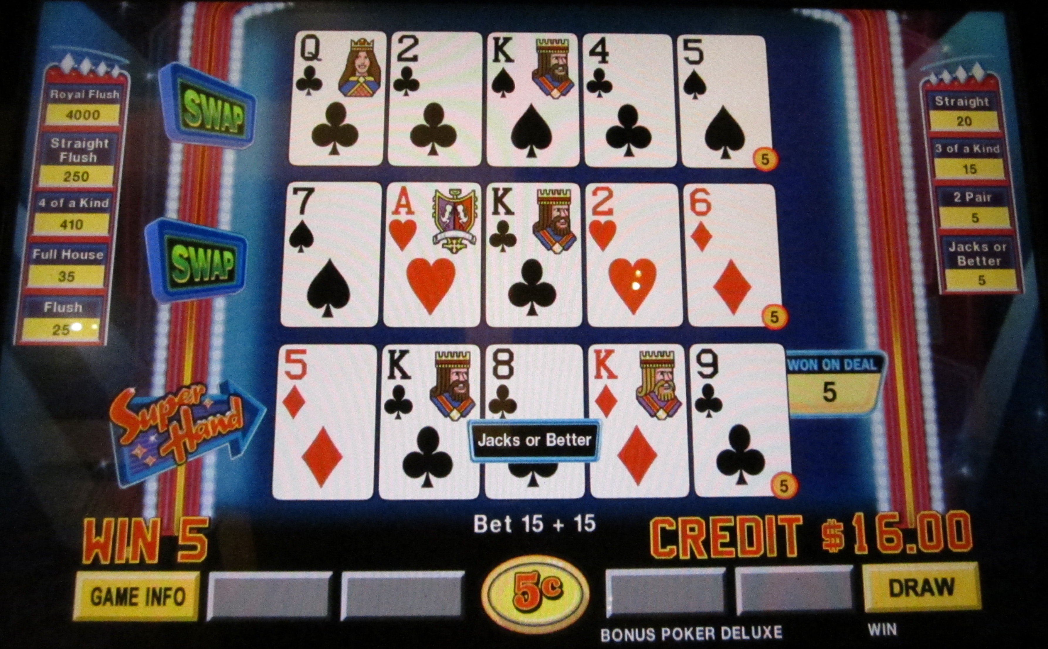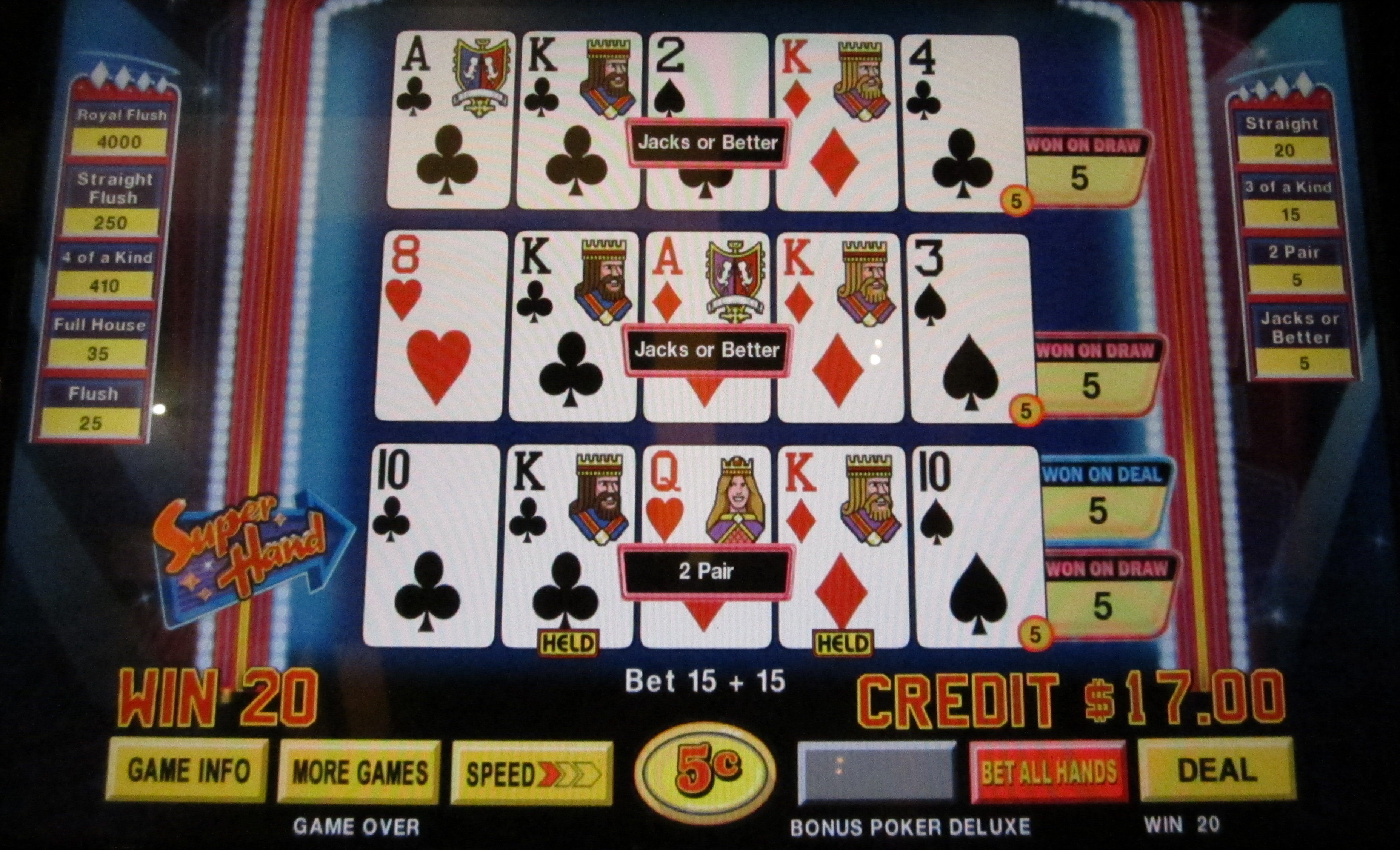 Eu tinha um par de reis, que se transformou em um par duplo na mão de baixo e permaneceu um par alto nas outras duas. Cada mão pagou cinco créditos no descarte, totalizando 15 créditos. Contando tanto a distribuição quanto o descarte, meu "ganho" total foi de 5 + 15 = 20 créditos. Dado que a aposta custou 30 créditos, na verdade foi uma perda de 10 créditos.