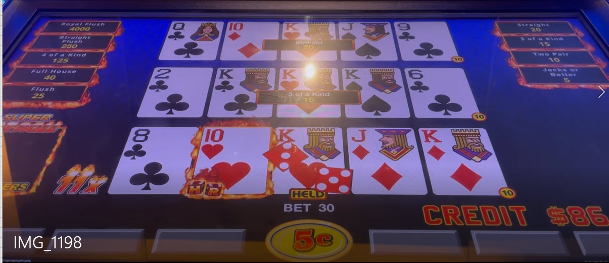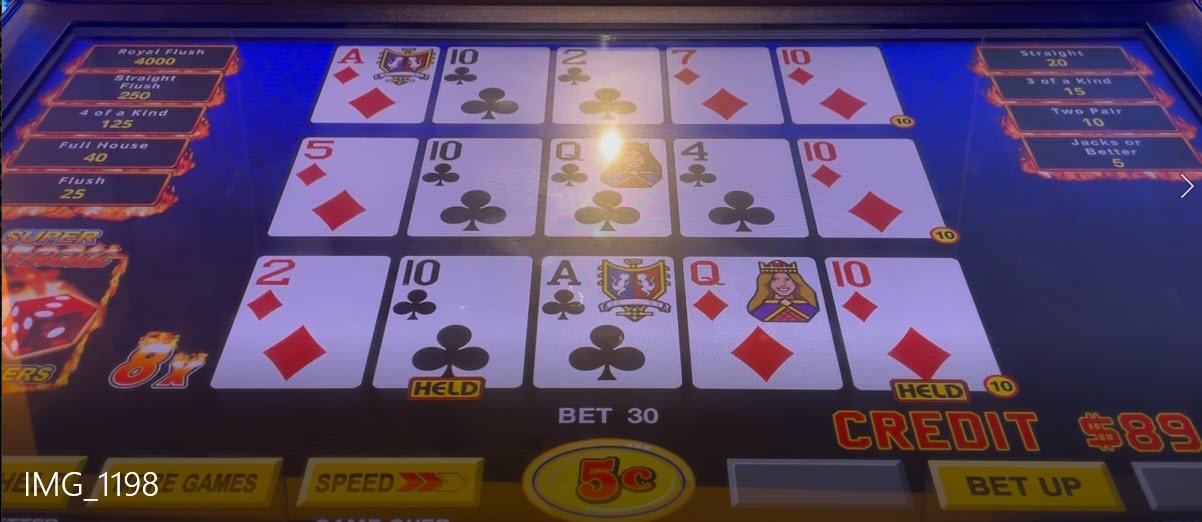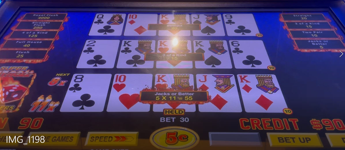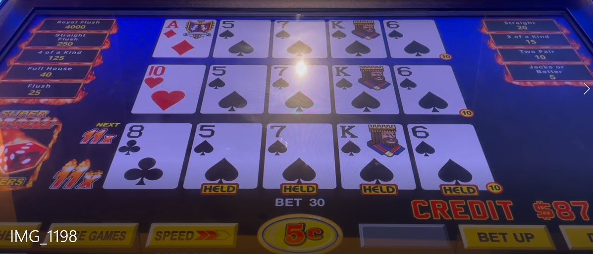 Meu par de ases se transformou em um par duplo na mão superior. Na mão inferior, ganhei aleatoriamente um multiplicador de 11x. O jogo base era o Bonus Poker 6-5, que paga 1 para 1 para valetes ou melhor e 2 para 1 em um par duplo. Com uma aposta de 5 moedas por jogada, meu "ganho" total foi de 5×(2 + 1 + 1×11) = 70 créditos.