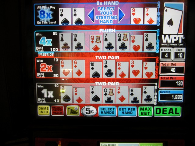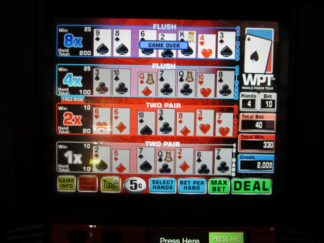 Eu consegui um flush no nível quatro, que paga 2,5x pelo flush e 8x pelo quarto nível, para um ganho total nessa mão de 10 × 2,5 × 8 = 200 moedas, para um ganho final de 330 moedas.