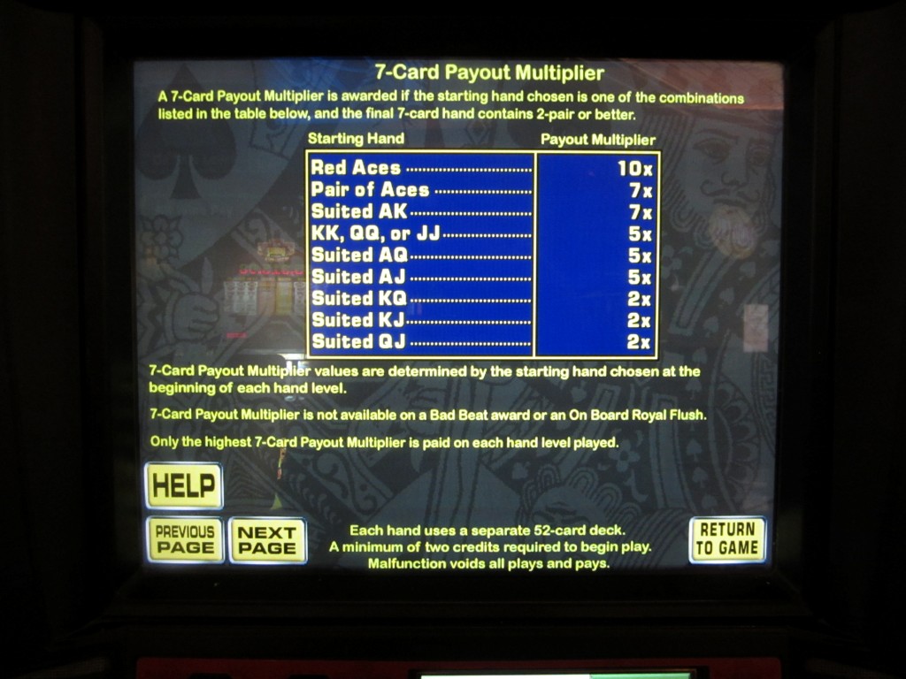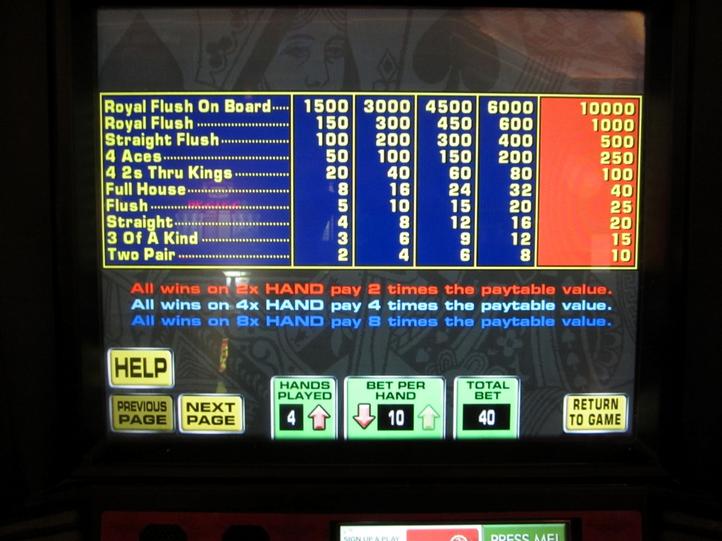 - O jogador receberá o pagamento de acordo com a melhor mão de pôquer de cinco cartas entre as sete cartas. Cinco tabelas de pagamento estão disponíveis no site do desenvolvedor do jogo, conforme descrito a seguir. Esta tabela mostra o ganho por moeda apostada por mão, com base em uma aposta máxima de dez moedas por linha. Cada tabela de pagamento é identificada pelo valor pago por um full house, flush e straight, respectivamente, para uma aposta de 2 moedas por mão. Os dois maiores prêmios pagam desproporcionalmente menos para apostas inferiores a dez moedas por mão, o que o jogador nunca deve fazer.