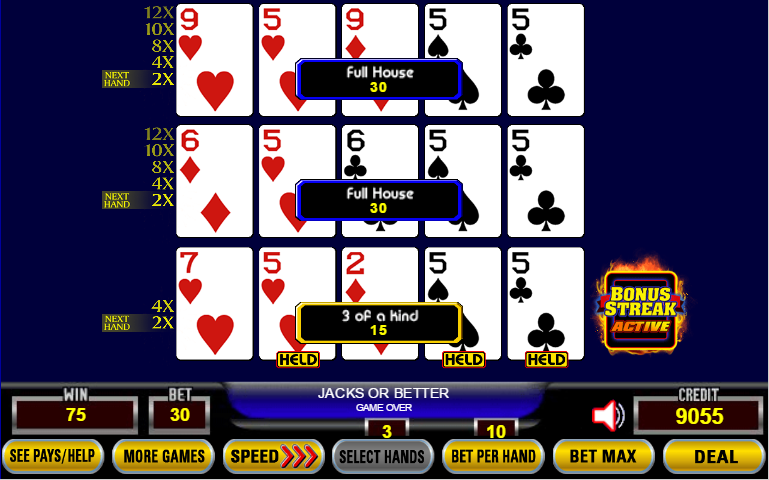 Na primeira partida, recebi uma trinca na distribuição das cartas, que se transformou em um full house após o empate nas duas mãos superiores. Com base em uma aposta de cinco moedas por mão (sem contar a taxa extra de cinco moedas por mão para ativar o recurso Streak), meu ganho imediato foi de 30 créditos por cada uma das duas mãos superiores e 15 créditos pela trinca na mão inferior, totalizando um ganho de 30 + 30 + 15 = 75 créditos.