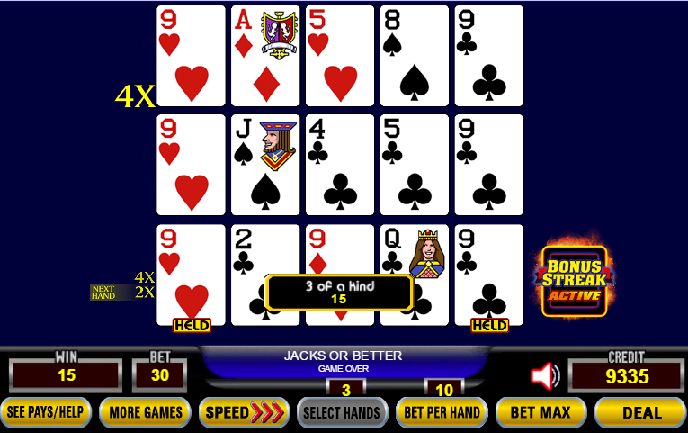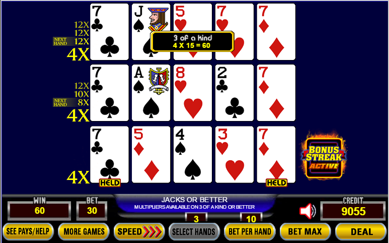 Aqui, cada mão começou com um multiplicador de 4x. Meu par baixo da mão inicial se transformou em apenas uma trinca na mão superior. Com base em uma aposta de cinco moedas, uma trinca paga 15 créditos. Após aplicar o multiplicador de 4x, meu ganho é de 4 × 15 = 60 créditos.