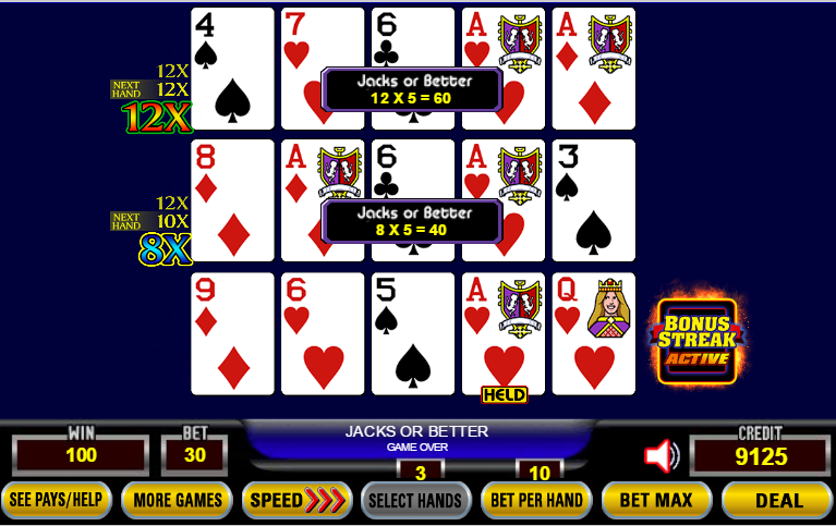 Neste jogo, recebi um ás, que se transformou em pares altos nas duas mãos superiores. Felizmente, essas mãos tinham multiplicadores. Um par alto paga 5 créditos por mão. Além disso, a mão superior tinha um multiplicador de 12x e a do meio, de 8x. Portanto, meu ganho total foi de 5 × 12 + 5 × 8 = 100 créditos.