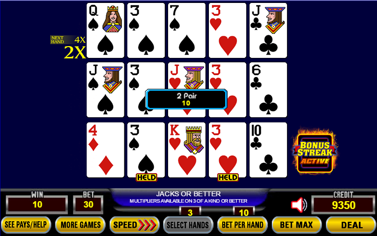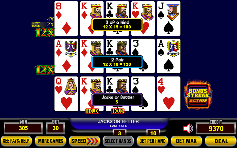 Em Jacks or Better, um full house garante uma sequência bônus de 2-4-8-10-12 nas próximas cinco mãos. Uma trinca garante uma sequência bônus de 2-4 nas próximas duas mãos.