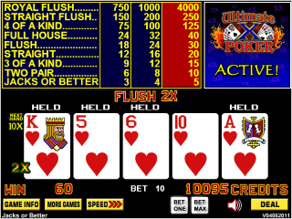 Ultimate X é uma variante popular de video poker. A diferença é que, se o jogador dobrar a aposta, qualquer mão vencedora não só paga de acordo com a tabela de pagamentos, como também concede um multiplicador na mão seguinte. Esta página aborda a versão de linha única do Ultimate-X Poker, que pode ser encontrada nas máquinas Five Star. Tenho uma página separada para a versão de múltiplas linhas .