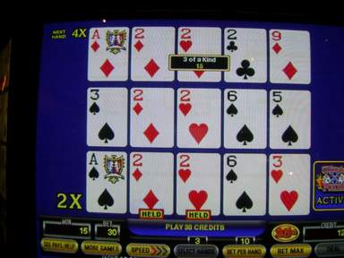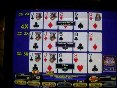 A próxima captura de tela mostra a próxima mão. Na mão de cima, recebi um par de valetes. Normalmente, isso pagaria 5 moedas, mas o multiplicador de 4x aumenta para 20 moedas. As mãos do meio e de baixo não multiplicaram, mas ganhei multiplicadores para a próxima mão (2x para as mãos de cima e do meio e 3x para a mão de baixo), porque apostei o máximo de 30 moedas.