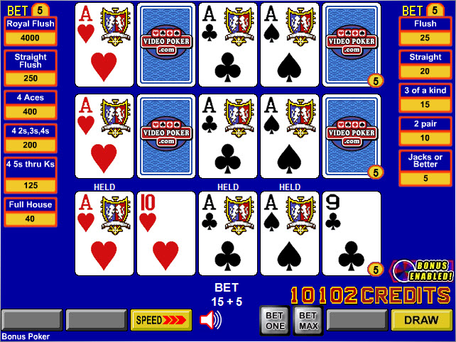 Eu estava jogando Bonus Poker de 3 mãos, com o recurso de bônus ativado. Recebi uma trinca na distribuição das cartas, então ganhei o bônus.
