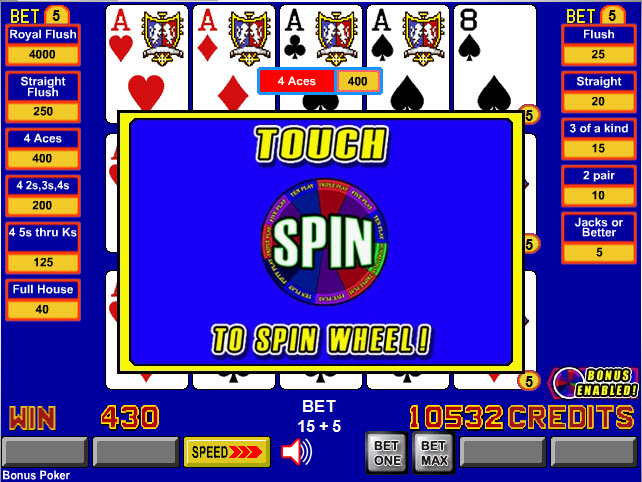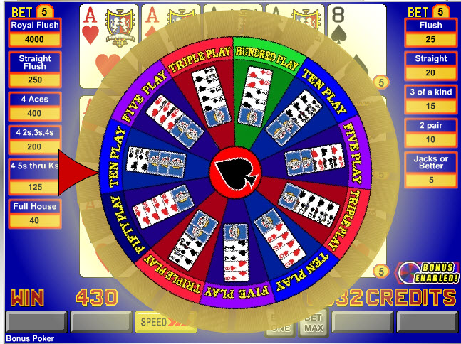 O bônus consiste em uma roleta giratória que parará em uma das onze possíveis mãos iniciais de vídeo pôquer. O jogador então jogará essa mão e receberá o pagamento de acordo com o resultado e as tabelas de pagamento de bônus especiais.