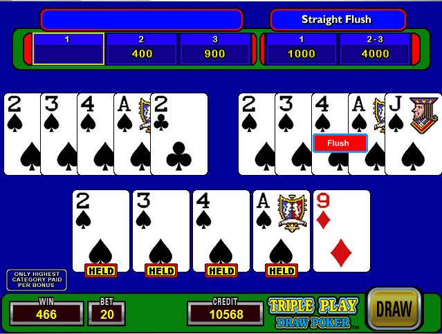 Não é preciso decidir quais cartas manter; a seleção é automática. As tabelas no topo mostram os possíveis ganhos. Observe o quadro explicativo no canto inferior esquerdo que diz "Apenas a categoria mais alta paga por bônus".
