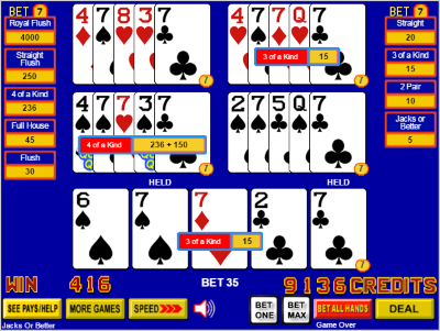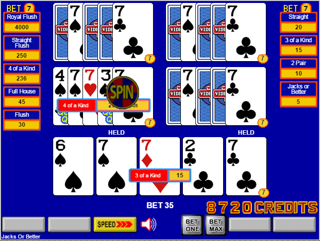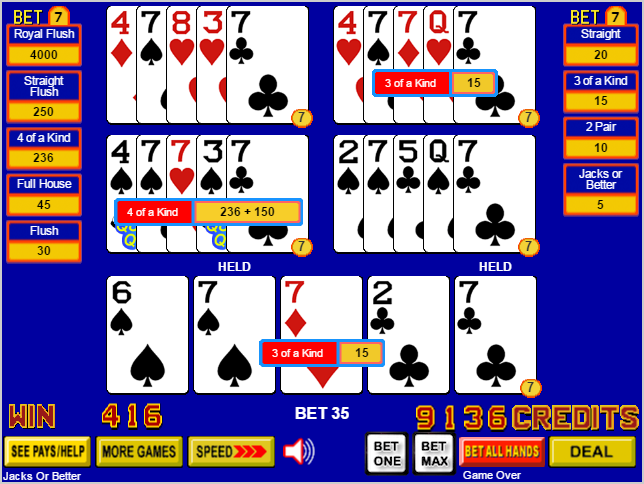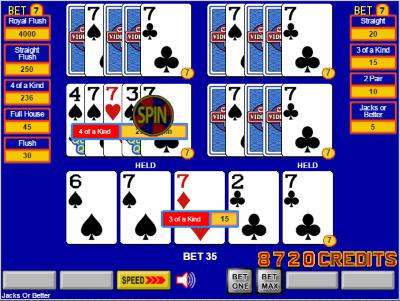 O jogo é baseado em video poker de três ou cinco jogadas.