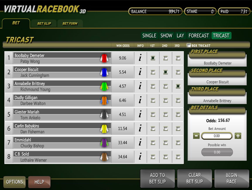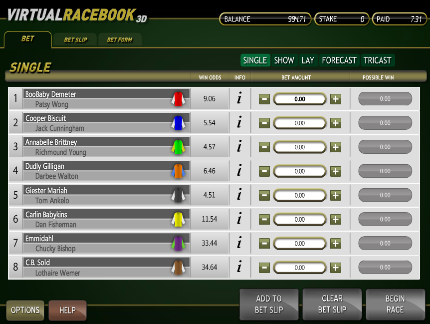 Virtual Racebook 3D é um jogo de corridas de cavalos oferecido pela Betsoft . O jogo apresenta cinco maneiras diferentes de apostar e uma experiência de corrida muito realista.