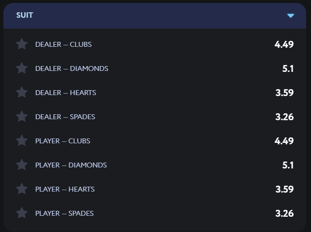 - Naipe de cada lado: Oito apostas disponíveis no naipe de cada lado; por exemplo, a carta do Jogador será de paus.