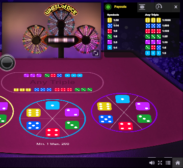 Wheel of Dice é um jogo de azar simples que encontrei em um cassino online que utiliza o software da Evolution Gaming. O jogo usa três rodas com 32 paradas cada. Cada parada mostra a face de um dado, de um a seis. Quanto menor o número de pontos, mais vezes ele aparece nas rodas. O jogador pode escolher em qual roda apostar e em qual face ela irá parar. Há também uma aposta paralela baseada nas três rodas.