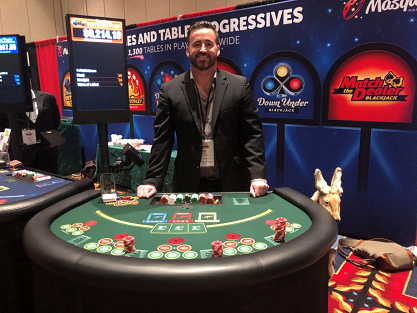 Em seguida, temos Kyle Morris com seu jogo mais recente, Down Under Hold 'Em. Todos os jogos de Kyle usam cartas especiais e um leitor espelhado para, essencialmente, dar uma olhada na carta e determinar se ela é de valor baixo, médio ou alto. Este jogo é baseado no Mississippi Stud. Ele permite que o jogador tome decisões sabendo em qual grupo a próxima carta se encaixará.