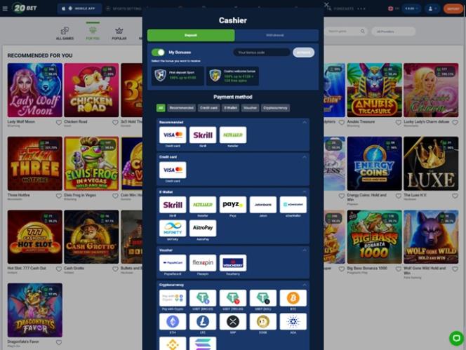 Os termos e condições são padrão, sem nada que se destaque como injusto ou predatório para os jogadores.Abaixo estão as opções bancárias da 20Bet, incluindo as opções de depósito e saque.