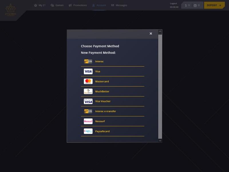 Abaixo está uma lista das promoções atualmente oferecidas no 21 Casino.