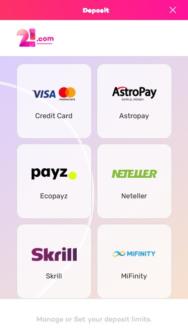 O 21.com é alimentado por Microgaming, Net Entertainment, BetSoft, 1x2gaming, Barcrest, Big Time Gaming, ELK Studios, Evolution Gaming, Genesis Gaming, iSoftBet, lightningboxgames, Novomatic, Oryx, Play'n GO, playson, Quickspin, Rabcat, Relax Gaming, Thunderkick, Yggdrasil, Endorphina, Wazdan, Booming Games, Pragmatic Play, Nolimit City, Felt Gaming, Red Tiger Gaming, Fantasma Games, FunFair, Kalamba, Triple Edge Studios, Northern Lights Gaming, Stormcraft Studios, Switch Studios, OneTouch, Electric Elephant Games, Pocket Games Soft, Bulletproof Games, All41 Studios, Gluck Games, Gameburger Studios, Pulse 8 Studios, Neon Valley Studios, Golden Rock Studios, Spearhead Studios, Swintt, Shuffle Master, SpinPlay Games, GONG Gaming, Blue Guru Games, Lady Luck Games, Buck Stakes Entertainment, Games Global, 2by2 Gaming, Bally Technologies, bluberi, Blueprint Gaming, GamesOS, Greentube, NextGen, Push Gaming, WMS, SG Interactive, Gamomat, Red7Mobile, Side City Studios, Bally Wulff, Iron Dog Studio, Foxium, Just For The Win, Reflex Gaming, Storm Gaming Technology, PearFiction Studios, Wild Streak Gaming, Slingshot Studios, Golden Hero, Fortune Factory Studios, Jade Rabbit Gaming, STHLM Gaming, RubyPlay, 4ThePlayer, AvatarUX, Gamevy, Crazy Tooth Studio, ReelPlay, Japan Technicals Games, Alchemy Gaming, Black Pudding Games, Snowborn Games, Boomerang Studios, Hacksaw Gaming, Max Win Gaming, Gold Coin Studios, Bang Bang Games, Half Pixel Studios, SilverBack Gaming, Peter And Sons, Eurostar Studios, Aurum Signature Studios, Armadillo Studios, FlipLuck, Area Vegas, Leap Gaming, Atomic Slot Lab and Indigo Magic e o próprio cassino possui uma plataforma web integrada que carrega através do seu navegador de internet favorito. Isso elimina a necessidade de baixar softwares complexos e torna o processo de jogar no site muito mais fácil. É claro que o jogo em dispositivos móveis é totalmente compatível, permitindo que você aposte usando seu smartphone ou tablet.