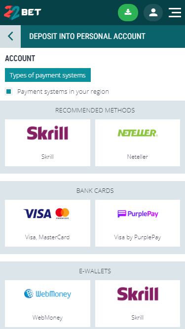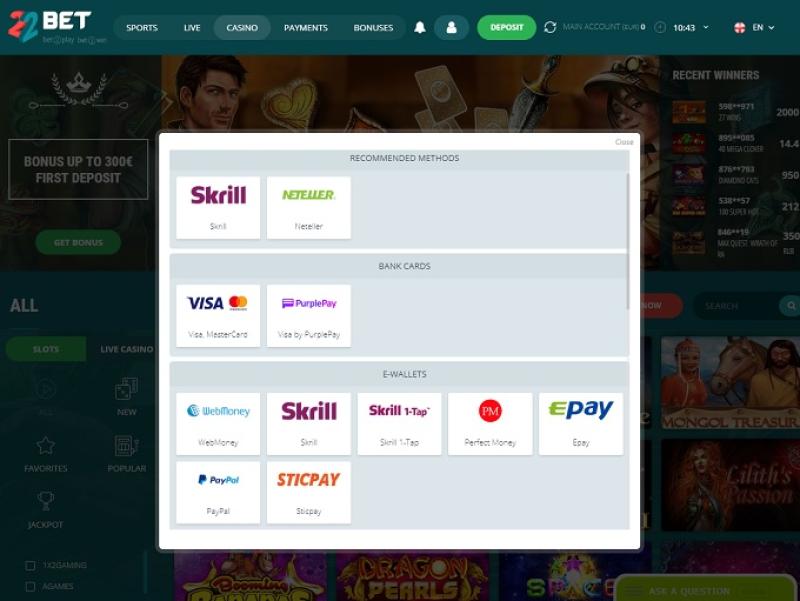 Opções bancárias no 22Bet Casino