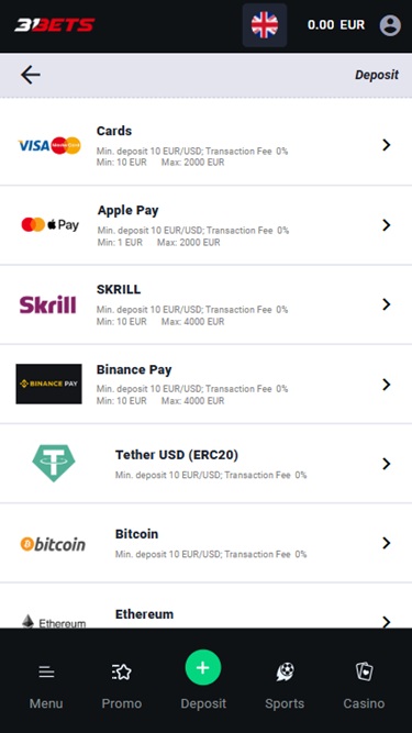 Os jogadores podem depositar usando moedas fiduciárias e criptomoedas.