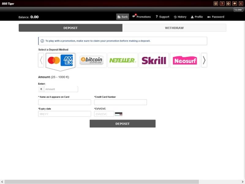 O 888 Tiger Casino é operado pela Rival, Vivo Gaming and Dragon Gaming e os jogos são oferecidos através de uma plataforma online que carrega pelo seu navegador. Não há nenhum software para baixar, o que é ótimo, e você também poderá jogar no seu smartphone ou tablet, se desejar.