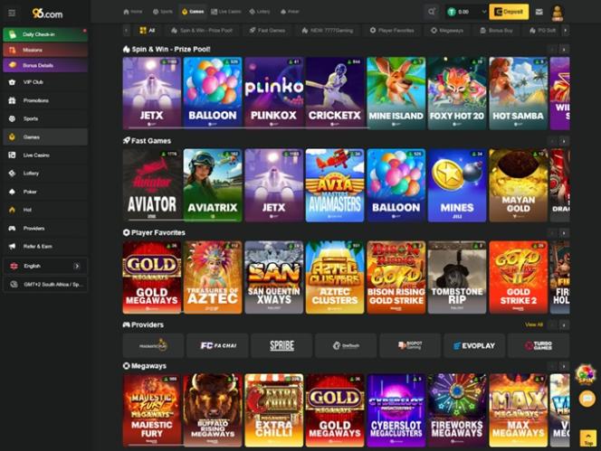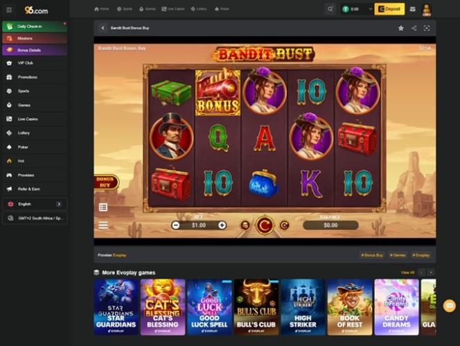 Para os fãs de slots, o 96.com Casino oferece uma seleção muito competente de caça-níqueis. Com desenvolvedores de software líderes do setor, as opções de slots são garantidas, entre as quais podemos citar Sweet Bonanza, Fortune Tiger, Gates of Olympus, Buffalo Blitz, Cat Queen, Money Train 2, Big Bass Bonanza, Wolf Gold, Spaceman, Age of the Gods: King Of Olympus, Jungle Giants, Gem Heat, The Greatest Catch, Iron Bank, Fire Strike, Diamond Strike, Jungle Delight, Hellcatraz e The Great Pigsby.