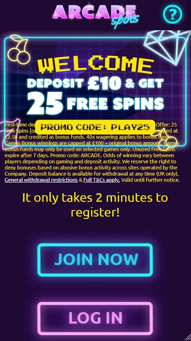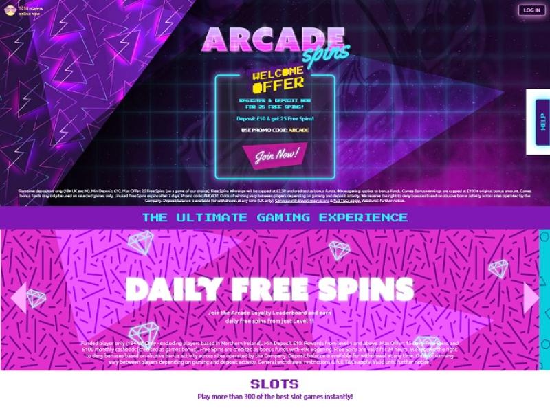 O Arcade Spins Casino é um site de apostas online que foi renomeado a partir do Deal or No Deal Casino em 2017. O site é operado pela Cassava Enterprises, uma subsidiária da gigante das apostas 888 Holdings. Com um visual retrô e um bom sistema bancário, o Arcade Spins é um site de apostas decente focado em caça-níqueis, mas peca um pouco por termos de bônus irrazoáveis e limites bancários baixos, inaceitáveis para uma operadora desse porte.