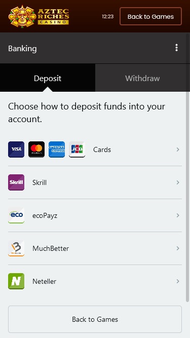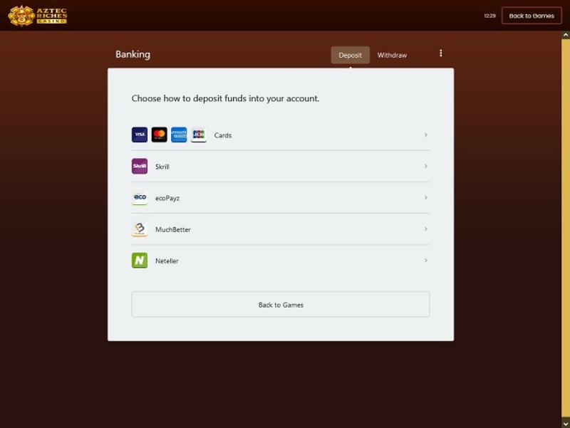 Em Aztec Riches, os jogadores ganham 1 ponto de fidelidade a cada US$ 10 apostados no cassino. Os jogadores podem trocar 100 pontos por US$ 1 em dinheiro real para usar nos jogos do cassino.Informações sobre a licença