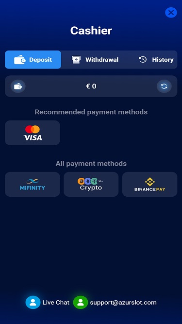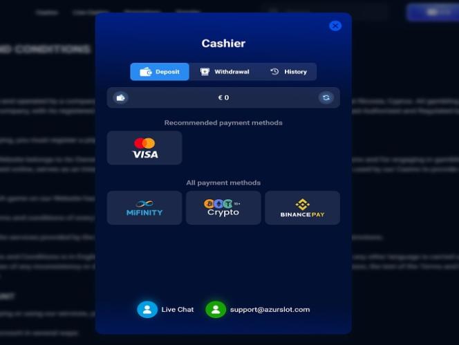 Para se tornar membro do cassino AzurSlot e ter acesso à sua vasta biblioteca de jogos, você precisará concluir o processo de registro fornecendo os dados padrão de inscrição ou poderá fazer login diretamente usando sua conta do Google. O AzurSlot é compatível com VPN, portanto, não há risco de bloqueio por usar uma VPN.