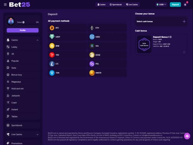 O Bet25 é um cassino online voltado principalmente para criptomoedas, e você poderá depositar e sacar fundos usando diversas criptomoedas, incluindo Bitcoin , Bitcoin Cash , Dogecoin, Ethereum , Litecoin, Solana , Toncoin , Tron , USD Coin e Tether.