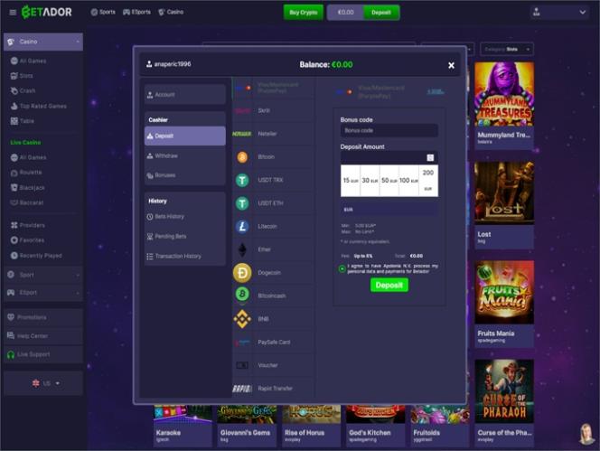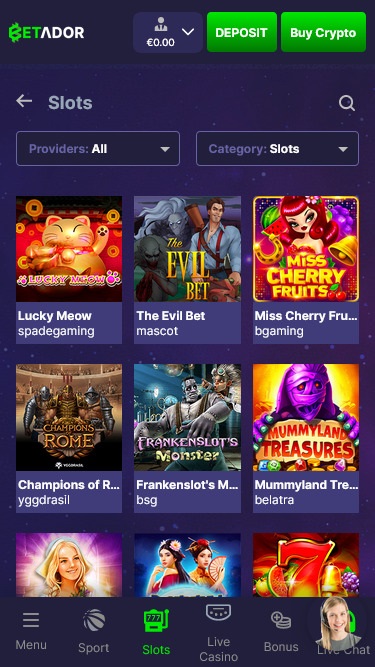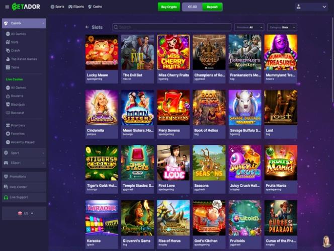 Lobby, Cassino ao Vivo, Caça-níqueis, Crash, Jogos Mais Bem Avaliados e Jogos de Mesa são as principais categorias da seção Cassino. Embora já tenhamos visto bibliotecas de jogos muito maiores, os jogadores poderão experimentar uma ampla variedade de gêneros no Betador, incluindo jogos de criptomoedas populares que atraem especialmente os membros de cassinos modernos.