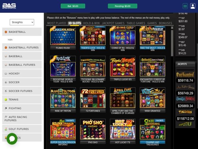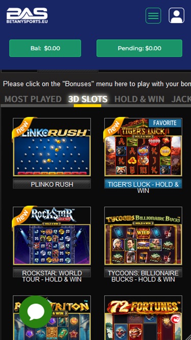 A BetAnySports oferece uma boa variedade de slots, incluindo diversos caça-níqueis de vídeo e uma boa quantidade de jogos clássicos de 3 cilindros. Há também opções para jogar em dispositivos móveis, além de alguns jackpots progressivos com grandes prêmios em dinheiro.