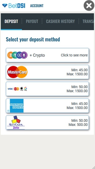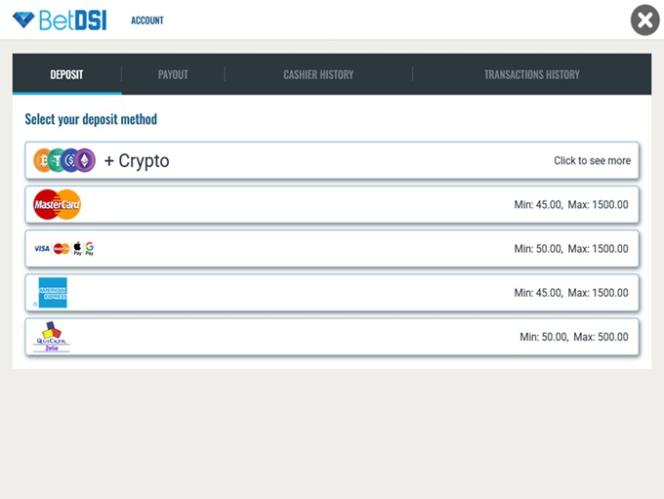 Como mencionado anteriormente, a BetDSI aceita criptomoedas como método de pagamento válido. Bitcoin, Ethereum, Litecoin e Ripple são apenas algumas das muitas disponíveis. No entanto, esteja ciente de que a maioria das criptomoedas é aceita apenas como método de depósito — as opções de saque são menos variadas.
