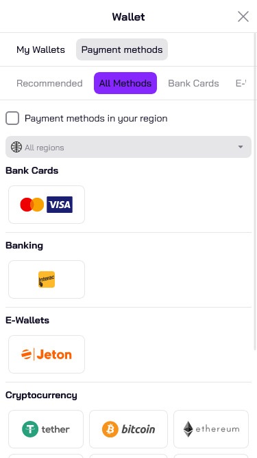 A marca aceita diversos métodos de pagamento para seus jogadores. Há várias opções tradicionais com as quais a maioria das pessoas já está familiarizada, como Visa , Mastercard , Neteller , Skrill , Neosurf e Paysafecard . Além disso, os apostadores podem depositar e sacar usando criptomoedas, com todo o processo sendo simplificado pela plataforma Binance. As moedas disponíveis são Bitcoin , Bitcoin Cash , Dogecoin , Ethereum , Tether , Ripple , Tron , USD Coin e Litecoin .