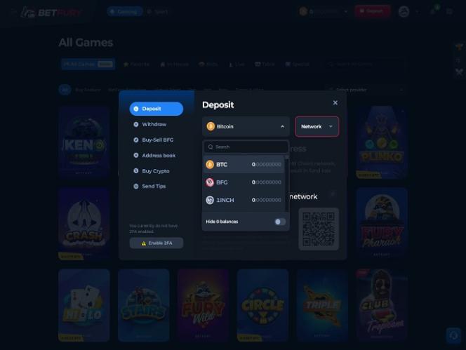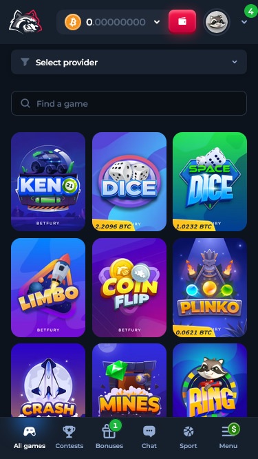 Jogos internos: Dice, Space Dice, Limbo, Cara ou Coroa, Keno, Plinko, Crash, Mines, Ring, Cryptos, Tower, Fury Pharaoh, Hi LO, Stairs, Fury Wild, Circle, Triple