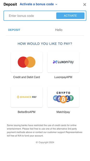 Ficamos satisfeitos em ver que a marca oferece aos jogadores uma ampla variedade de opções de pagamento. Para começar, há métodos tradicionais como Visa , Mastercard , AstroPay , Jeton e Interac . Além disso, depósitos e saques em criptomoedas também são aceitos, com as moedas disponíveis sendo Bitcoin , Ethereum , Litecoin , Tether , Tron e Ripple .