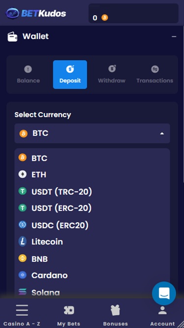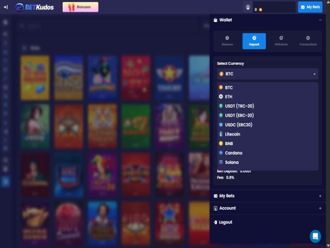 Para efetuar depósitos, você precisará usar algumas das opções de pagamento em criptomoedas e depositar em algumas das moedas digitais mais populares, incluindo ADA (Cardano), BTC (Bitcoin), ETH (Ethereum), LTC (Litecoin), SOL (Solana) e USDT (Tether).