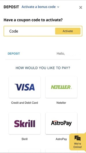 Uma ampla variedade de métodos bancários são aceitos aqui, desde cartões de débito e crédito até serviços como Skrill e Neteller.