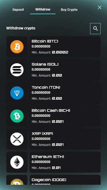 Os jogadores podem comprar criptomoedas diretamente no site usando moedas fiduciárias.