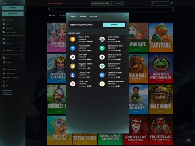 Como já mencionamos, o Betrunner Casino é um site de jogos de azar exclusivo para criptomoedas, onde os jogadores podem depositar e sacar fundos usando diversas criptomoedas, incluindo Bitcoin , Bitcoin Cash , Cardano , Dogecoin , Ethereum , Solana , Tether , Toncoin , Tron , USD Coin e Ripple . Quem ainda não possui uma carteira de criptomoedas pode comprar criptomoedas diretamente no site usando Visa e Mastercard .