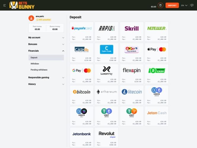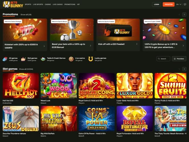 Fundado em 2025, o Bets Bunny é um cassino online moderno que se concentra em oferecer aos seus jogadores canadenses e finlandeses um vasto catálogo de opções de jogos, incluindo jogos de cassino como caça-níqueis online, jogos de mesa, jogos com crupiês ao vivo e jogos de crash, além de uma seção de apostas esportivas completa com centenas de opções. A marca oferece um programa promocional robusto repleto de bônus e promoções, e suporte a criptomoedas para transações mais rápidas e seguras.