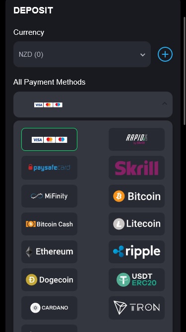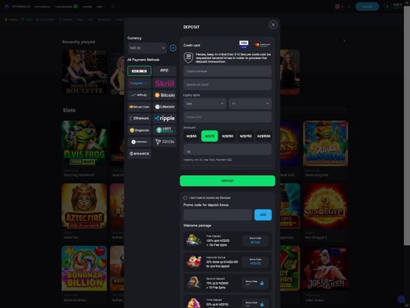 Existem diversas opções de depósito disponíveis no Bitvegas Casino. Além de depositar com criptomoedas, os jogadores também podem optar por depositar utilizando métodos populares como MasterCard, Visa e Neteller. Caso prefiram, os jogadores também podem utilizar o Skrill .