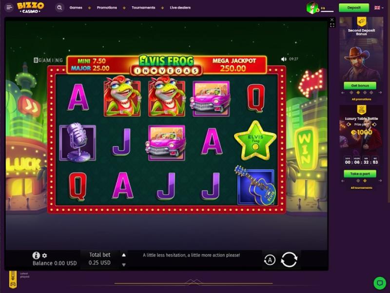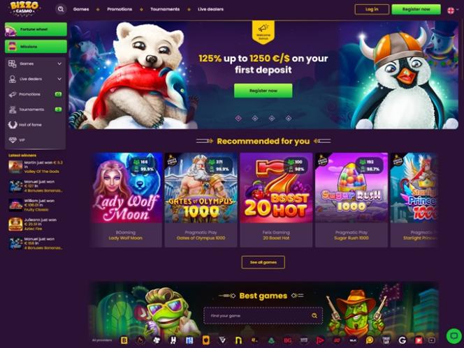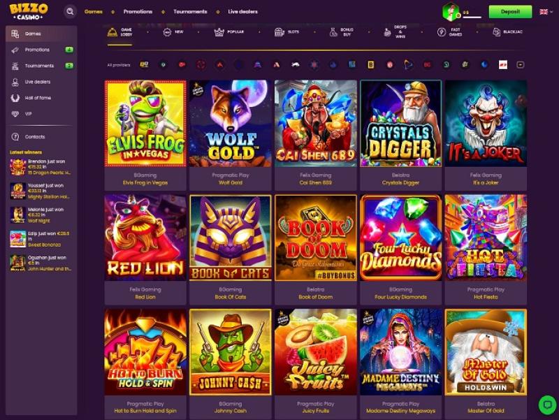 No caso da Bizzo, a longa lista de fornecedores de cassino fez com que a seção de slots ficasse repleta de títulos de alta qualidade: Cazombie, It's a Joker, 777 Spinbox, Elvis Frog in Vegas, Hot & Spicy, Johnny Cash, Book of Eye, Assassin Moon Hyper Hold, Mechanical Clover, 100 Joker Staxx 100 Lines, Take Olympus, Startup Valley, Africa Cold 2 Treasure Way, #buyBonus of Maya, Book of Cats, Wolf Power Hold and Win, Moon Sisters: Hold and Win, 3 Coins, Book of Cai Shen, Book of Divine, Book of Tribes Reloaded, Buffalo Rampage, Fire in the Hole xBomb, Four Lucky Diamonds, Kitsune's Scrolls Expanded Edition, Egyptian Dreams Deluxe, Jellyfish Flow, Knockout Football, Knockout Football Rush, London Hunter, Magic Oak, Presto!, Pumpkin Patch, Santa's Village...