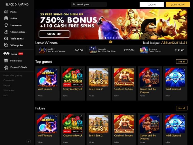 Existem dezenas de jogos de slots disponíveis no Black Diamond Casino, incluindo dezenas de slots de vídeo e vários jogos clássicos de 3 cilindros. Três desses jogos oferecem jackpots progressivos, que dão aos jogadores a oportunidade de ganhar prêmios que podem ultrapassar um milhão de dólares.